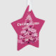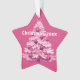 Ornament for a child with photo and year date. Pink Christmas tree design on the front of a star-shaped ornament, with round photo template on the back. Add the child's name beneath the photo.