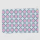 Towels with a pink circular pattern on a blue geometric background hang on a rack. Below, a matching washcloth is folded on a neutral surface.