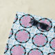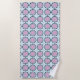 Towels with a pink circular pattern on a blue geometric background hang on a rack. Below, a matching washcloth is folded on a neutral surface.