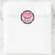 Ein Aufkleber mit einer Abbildung eines heißen rosa Kuchen, umgeben von einem passenden Rahmen. Hintergrund sind weiße Polka Punkte über schwarz.
