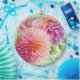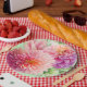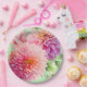 Rosa Dahlia-Blume haben zwei schöne rosa und lila gestrichene Dahlia-Blume und eine niedliche kleine Knospe. Grüne Blätter und Stiele mit kleinen weißen Blume wirken als Akzent im gemusterten Bild. Die Single-Gruppierung von Blume ist groß und erstreckt sich über die Ränder hinaus.
