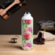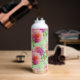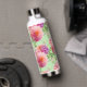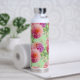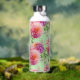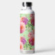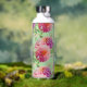 Rosa Dahlia-Blume haben zwei schöne rosa und lila gestrichene Dahlia-Blume und eine niedliche kleine Knospe. Grüne Blätter und Stiele mit kleinen weißen Blume wirken als Akzent im gemusterten Bild. Die Single-Gruppierung von Blume ist groß und erstreckt sich über die Ränder hinaus.