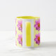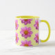 Ein Muster aus rosa Dahlien auf gelbem Hintergrund. Auch wenn die Blume nicht im Garten blühen, sind sie der Zeitpunkt, an dem man nach dieser Tasse reicht. Denken Sie an den Sommer, wenn Sie Ihren Kaffee oder Tee trinken.