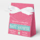 Diese eleganten Pink Damask Gefälligkeitsboxen sind perfekt für jede Babydusche! Ein glänzender, hellrosa Damast-Hintergrund mit einem blauen Band, in dem "Baby Dusche" steht.