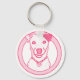 Ein Schlüsselanhänger mit einem rosa-weißen Foto eines Jacks Russell Terrier, der aus einem kongruenten Rahmen herausguckt.