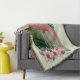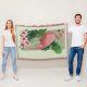 Ein rosa Flamingo mit grünen tropischen Blätter und rosa Lilien in hellrosa Umgebung