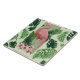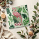 Ein rosa Flamingo mit grünen tropischen Blätter und rosafarbenen Lilien in hellgrüner Umgebung