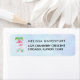 Adressetiketten mit einer Illustration eines Mama- und Baby-rosa Flamingo stehend auf einem Bett von blumengeschmückten Blume mit grünen Palmen im Rücken schweben. Tropisch und hübsch. Der Hintergrund ist hellblau.