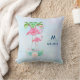 Ein personalisiertes Kissen mit einem Namen und Initial. Entworfen mit einer Illustration eines Mama und Baby rosa Flamingo stehend auf einem Bett von blumensukkulenten Blume mit grünen Palmen schweben im Rücken. Tropisch und hübsch. Der Hintergrund ist eine sommerlich hellblaue Wasserfarbe mit lila Farbtupfern.