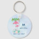 Schlüsselanhänger personalisiert mit einem Namen, Initial und Telefonnummer. Entworfen mit einer Illustration eines Mama und Baby rosa Flamingo stehend auf einem Bett von blumensukkulenten Blume mit grünen Palmen schweben im Rücken. Tropisch und hübsch. Der Hintergrund ist eine sommerlich hellblaue Wasserfarbe mit lila Farbtupfern.
