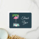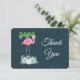 Eine Dankeschön-Karte mit einer Illustration eines rosa Flamingos mit grünen Palmen dahinter und einem dekorativen Blumenstrauß unten. Tropisch und hübsch. Der Hintergrund ist dunkelblau.