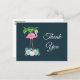 Eine Geburtstagsparty (oder andere Veranstaltung) danke Ihnen Postcard. Entworfen mit einer Illustration eines rosa Flamingo mit grünen Palmen im Hintergrund und einem dekorativen Blumenstrauß unten. Tropisch und hübsch. Der Hintergrund ist dunkelblau. Die Rückseite hat eine personalisierte Nachricht und Platz für Ihre Rücksendeadresse.