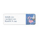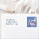 Das Design des Strandadressen-Labels besticht durch einen rosafarbenen Flamingo, der unter einer kunstvollen Anordnung von Imitaten aus Metallkattteln und Seestern stehend ist. ~