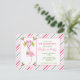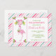 Festliche Weihnachten Party Einladung Postkarte. Ein rosa und grüne, mit Zuckerrohr gestreifter Hintergrund. Obergeschichtet ist ein extravagant rosa Flamingo mit einem Bein. Tragen Sie eine rosa Weihnachtsmannmütze und etwas saisonale heilige. Holly mit Beeren schmücken auch die Ecken. Ein Blumenstrauß über ihrem Kopf mit Bonbons überquerte sich.