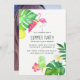 Sommergeburtstag feiern Foto Einladung mit exotischen tropischen Blättern und Blume, frischen Früchten, einem Flamingo und einem Kiwi Fruchtpopsikel.