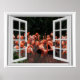 Tropisch rosa Flamingos, Fake-Fensterszene, für ein fensterloses Büro. Sehr realistisches Landschaftsoptik-Illusionsplakat, das gut auf einem Büro oder einer Studentenwand aussehen würde.