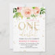 Ein süß rosa blumengeschmücktes Thema zum ersten Geburtstag für ein kleines Mädchen. Dieses Einladungs-Design verfügt auch über eine rosa und grüne Blumenstruktur, ein goldenes Imitat und Punkte sowie eine moderne Kalligraphie.