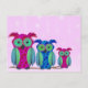 Drei niedliche, rosa und blaue Eulen, die auf einem Ast stehen.