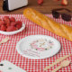 A white background, decorated with watercolored pink and ivory flowers in a wreath and a golden cross. A pink bow. Personalize and add the name and date.