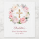 A white background, decorated with watercolored pink and ivory flowers in a wreath and a golden cross. Personalize and add the name and date.
