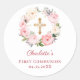 A white background, decorated with watercolored pink and ivory flowers in a wreath and a golden cross. Personalize and add the name and date.