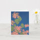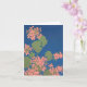 Eine Note mit einem Screenprint-Design von lachsrosa Geranien auf tiefblauem Hintergrund. Links für Ihre eigene Nachricht.