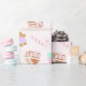 Ein niedliches Lebkuchenhaus, das mit schneeweißem Eis und pastellfarbenen Bonbons tropft. Hübsche rosa Fenster und eine gewölbte Türe auf einem würzigen braunen Rahmen, umgeben von Gumpfen, Lebkuchen, Bonbons, Weihnachtsbäumen und Holzlöffeln.