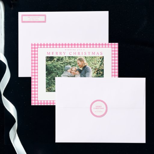 Pink Gingham Plaid Two Photo Feiertagskarte