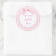 Rundaufkleber mit einem Bild von rosa und weiß Gingham. Der anpassbare weiße Kreis hat einen hellrosa Rahmen und einen optionalen hübschen rosa Bug mit Eistütendetails. Siehe passendes Packpapier. Die gesamte Kidz Korner Sticker Kollektion finden Sie unter CARDS & STICKERS Kategorie im KIDZ KORNER Bereich.