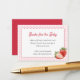 Featuring a soft red and pink color palette with charming strawberry details, the design complements spring baby girl celebrations while maintaining a clean and timeless look. The wording is warm and inviting, making it easy for guests to understand the request while keeping the tone gracious and celebratory.