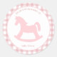 Baby rosa Gingham Karo personalisiert "aus dem Kinderzimmer" Umschlag Aufkleber mit niedlicher Rockpferde Silhouette.