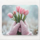 Ein Paar weiche, rosa Handschuhe hält sanft einen Strauß rosa Tulpen an einem ruhigen, schneebedeckten Hintergrund
