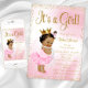 Afrikanisch-amerikanische Prinzessin Baby Dusche Einladung mit einem bezaubernden, ethnisch Prinzessinnen Baby Mädchen mit rosa Tutu und goldener Krone mit einer Perlenkette auf einem schönen rosa und goldenen Hintergrund. Diese elegante Rosa- und Golddusche lässt sich leicht an Ihre Veranstaltung anpassen, indem Sie Ihre Details in den Schriftart-Stil, die Farbe und den Wortlaut Ihrer Wahl einfügen. Sie können auch den Hintergrund entfernen und die Farbe Ihrer Wahl hinzufügen. Dies ist ein gedrucktes Design ohne echten Glitzer, Perlen, etc.