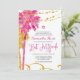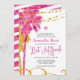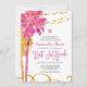 Moderne rosa Aquarell und Imitate Gold Glitzer tropische Bat Mitzvah Einladungen. Das Design umfasst Palmen, Saitenleuchten und Wirbel. Designs sind flache gedruckte Illustrationen/Grafiken - NICHT AKTUELLER GOLD GLITZER.