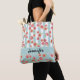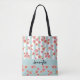Personalisierte Tasche mit einem digitalen Bild mit einem sich wiederholenden Muster aus rosa Pampelmusen, die mit Aquarellen hergestellt wurden, Set auf einem pastellgrünen und weiß gestreiften Muster. Eine grüne Grenze erstreckt sich über die Tasche mit Ihrem personalisierten Namen im Inneren. Der Boden der Tasche hat mehr Grapefruits auf einem soliden grünen Hintergrund.