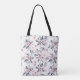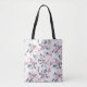 Eine Tasche mit elegantem Muster, die mit einer Aquarellabbilderung von rosa Blume mit blau-grauen Blätter und Stielen versehen ist.