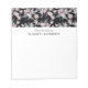 Ein Notizblock mit elegantem Muster, das mit einer Aquarellbilderung von rosa Blume mit blau-grauen Blätter und Stielen versehen ist.