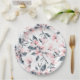 Teller aus Papier mit elegantem Muster, die mit einer Aquarellbilderung von rosa Blume mit blauen grauen Blätter und Stielen versehen sind.
