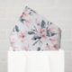 Gewebpapier mit elegantem Muster, das mit einer Aquarellabbilderung von rosa Blume mit blau-grauen Blätter und Stielen versehen ist.