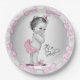 Adorable Vintage Mädchen Dusche Teller mit niedlichen Vintagen Baby Mädchen mit rosa Kruffelhose und Hausschuhen auf hübsch rosa und weiß Spitze und rosa Bug Hintergrund. Diese niedlichen, rosa und silberfarbenen Baby-Duschpapier-Teller können mit Texten im Schriftart-Stil und in der Farbe Ihrer Wahl angepasst werden. Sie können das Baby nach Bedarf verschieben und entfernen, dass es ein Mädchentext ist, um Ihre eigene hinzuzufügen.