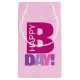 Eine gürmisch-rosa Geburtstagsgeschenktüte mit den Worten "Happy Bday!" in verschiedenen Farbtönen von Rosa und lila.