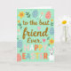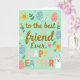 This design shows a mint-green background filled with small spring icons, setting a light, friendly mood 🌷. Near the top center, the line “to the best friend Ever.” appears in warm brown lettering with a smooth, flowing look, and tiny pink hearts sit close by like little hints of affection. Just beneath it, “HAPPY EASTER” is centered in thick sans-serif letters, with each character switching between soft coral, creamy white, sunny yellow, gentle blue, and bright orange for a lively rhythm. Around the text, simple round-petal flowers in pale yellow and soft pink mingle with small green leaves, as if the message is floating in a budding garden. Small star-like sparkles are sprinkled between the shapes, adding a subtle twinkle without crowding the layout. A few dotted egg shapes in dusty blue and pale coral sit off to the sides, balancing the composition and guiding your eye back toward the words 🐰. In the lower right corner, a small upright white bunny with light pink inner ears stands quietly with minimal facial details.