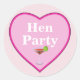 Aufkleber für Ihre Henne-Party-Mädchen. Grosses helles und dunkelrosa Liebe Herz mit weißer Schrift mit Hen Party. Darunter befindet sich ein Cocktailglas mit einem roten Cocktail. Der Hintergrund ist rosa mit winzigen weißen Polka-Punkten.