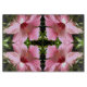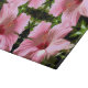 Aus einem Originalfoto von HomeWare gefertigt, sind hellrosa Hibiskus-Blume Gegenstand des originalen tropischen Gartenmusters mit einem "Country floral" Look auf diesem 11"x8" Schneidebrett. Es gibt vier schöne, breite offene Blüten, die von jeder Ecke nach innen zeigen. Die Blütenblätter der Blume sind in der Mitte sehr tief, wobei sie sich anmutig nach außen bewegen, während sich die Blätter in einem hellrosa Farbton abwechseln. Der Hintergrund besteht aus den natürlichen Grüntönen in den Blätter der Pflanze.