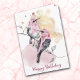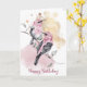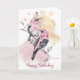 Zwei kleine, rosa und graue Kolibris stehen auf einem Ast an der Vorderseite dieser Geburtstagskarte. Hinter ihnen steht ein Spritzer aus Gold und Rosa, mit Rose Goldverzierung. Im Text unten steht "Glücklich zum Geburtstag". Die Innenseite der Karte hat zwei benutzerdefinierte Textfelder, mit denen Sie alles sagen können, was Sie möchten. Diese elegante und hübsche Karte ist für jeden geeignet.