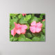 Dieser phantastische Leinenprint zeigt ein Foto von zwei hübschen rosa Farbtupfern, die Blume und das umliegende Laub beeindrucken. Die Blütenblätter leuchten und die Blätter sind nass aus einem Regenschirm.