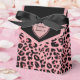Schick süße 16 Gastgeschenk Box in einem lachsfarbenen und schwarzen Jaguar Pelzmuster, mit einem rosa umrissenen schwarzen Frontlappen. Die Grafik eines lachsfarbenen Herzens, auf der Lasche, hat schwarzen Text bereit zu personalisieren. Stilvoll und elegant, ein echter Showstopper Günstige Container.