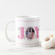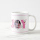 Pink Joy mit Beeren Weihnachts-Foto-Kaffee-Tasse. Es zeigt das Wort "JOY" in rosa mit roten Beeren und Grünpflanzen, während anstelle des Buchstabens "O" Ihr Foto steht.