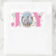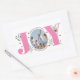 This rectangular sticker is a perfect addition to your Christmas gifts. It features the word "JOY" in pink with red berries and greenery, but with a unique twist - your photo replaces the letter "O". The sticker also includes the text "Merry Christmas" above your photo and your family name below it. Spread some pink joy this holiday season with this personalized sticker.
