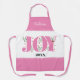 This apron is the perfect choice for adding a festive touch to your Christmas baking! It features a bright pink 'JOY' print surrounded by red berries and green leaves, set against a white background. Pink bands with scalloped edges at the top and bottom provide a beautiful contrast. To make it even more special, you can customize it with your name. Enjoy wearing this joyful apron while making holiday treats!